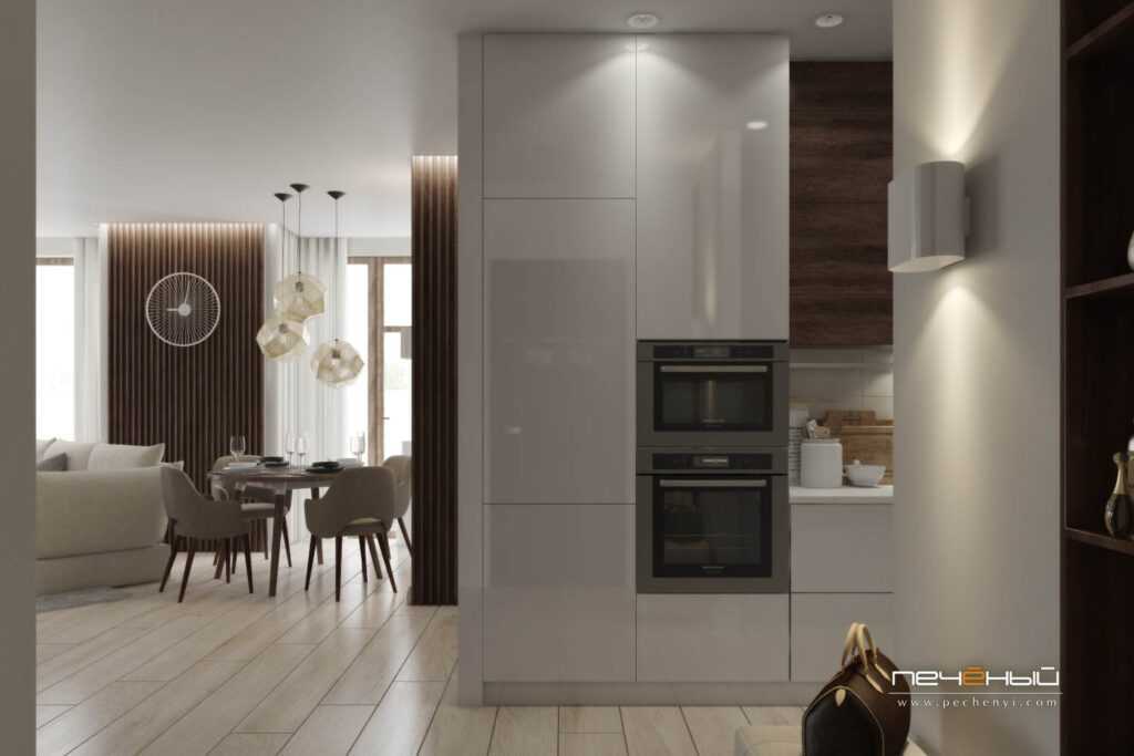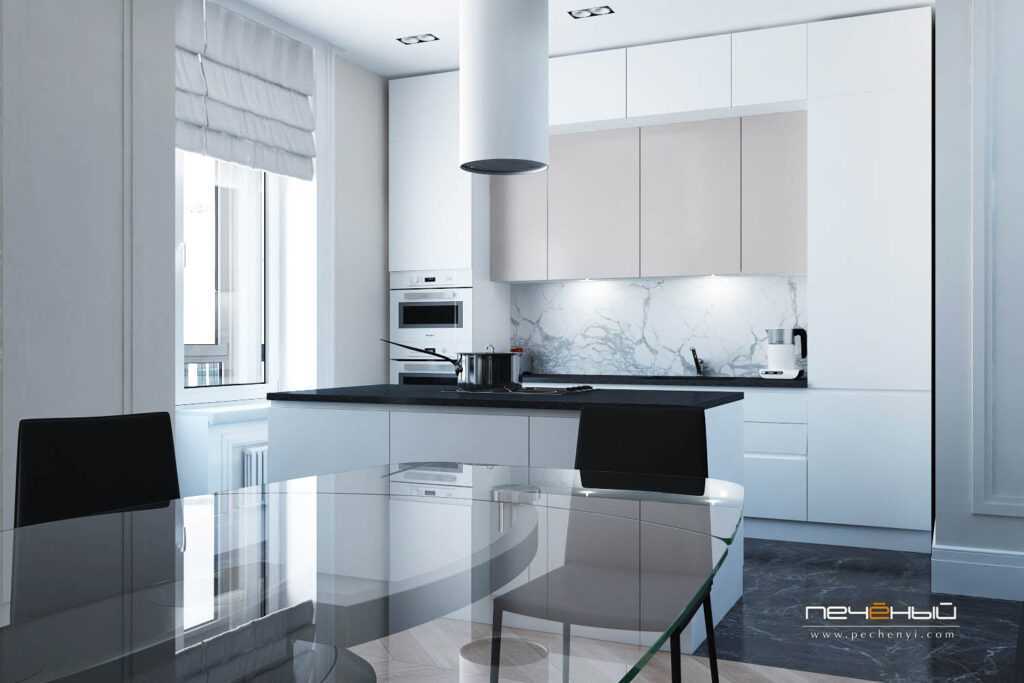 В совмещенной кухне, особое внимание обращают на качественную работу вытяжки и бесшумное функционирование бытовых предметов. При создании проекта, в первую очередь учитывают расположение вентиляций, от которых зависит размещение кухни.