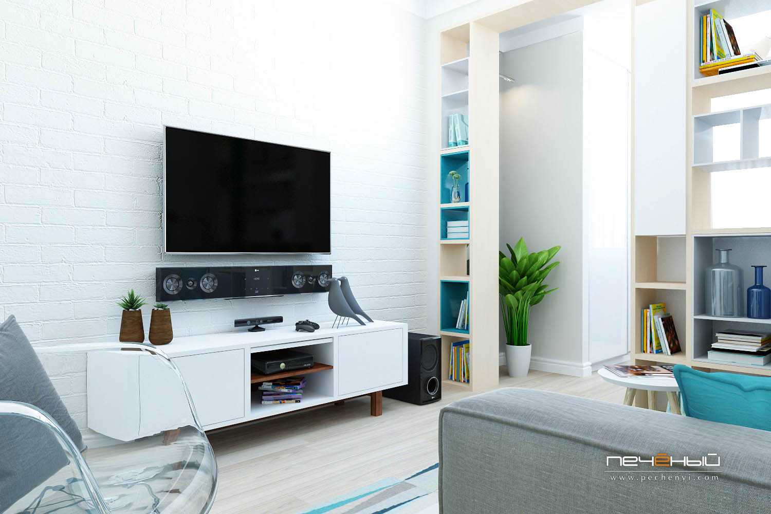 Поскольку родителям предстоит спать в гостиной, дизайнеры выбрали диван-трансформер, который превращается в полноценную двуспальную кровать. Напротив неё установили комод под телевизор и пару открытых полок для книг.