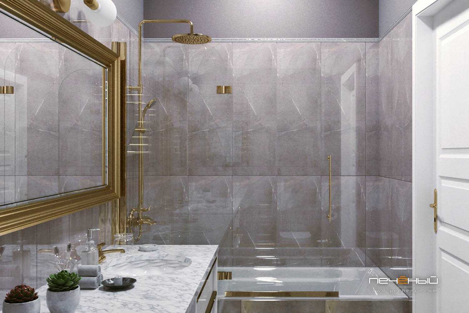 В этом роскошном интерьере было бы преступлением портить вид шторкой на ванне. А такое акриловое стекло прекрасно решает проблему с брызгами.