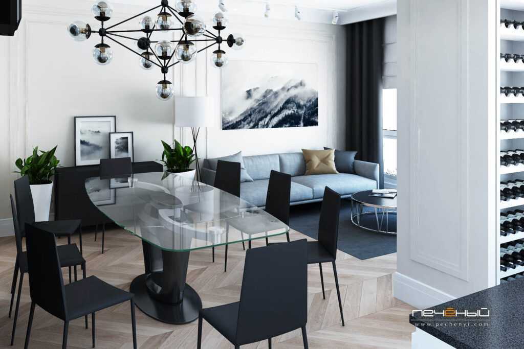 Для отделения обеденной зоны от гостиной разумно использовать невысокую перегородку, которая может служить не только разделителем пространства, но и подставкой под телевизор или дополнительной полкой для посуды. Очень красиво будет смотреться стеклянная перегородка с подсветкой.