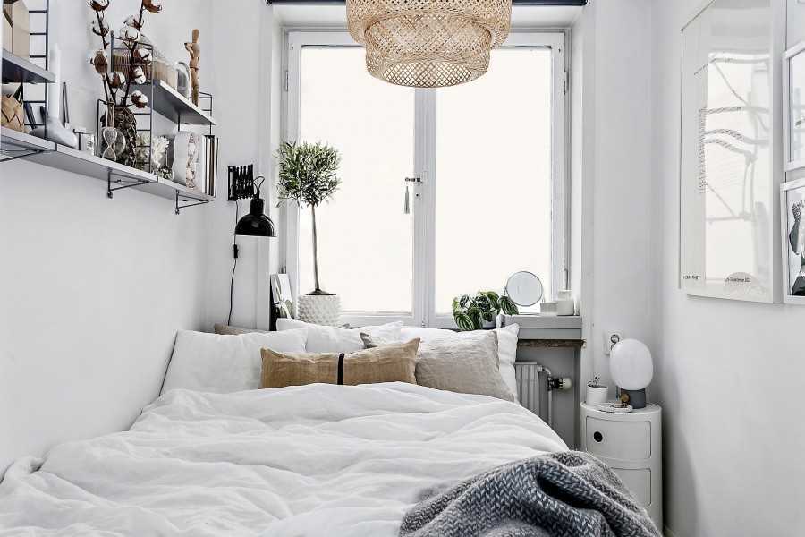 В обустройстве зоны для сна или обособленной спальни, используют минимальное количество меблировки. Например, предпочитают встроенные шкафы-купе, занимающие минимум площади, сверхузкие полки и стеллажи в изголовье кровати или компактные угловые конструкции.