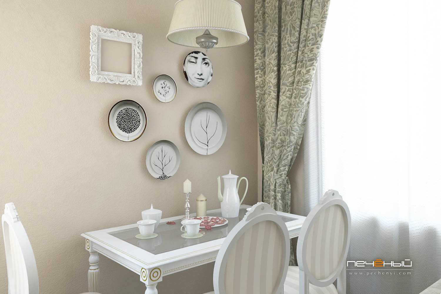 Обеденная зона должна иметь хорошее освещение. Стол лучше всего поставить возле окна. В дизайне кухни должны преобладать мягкие постельные оттенки. Для пола следует применять паркет, ламинат, плитку. Они впишутся в почти каждое помещение. Можно сделать многоуровневый потолок, над обеденной зоной расположить композицию из светильников. При покрытии стен нужно использовать водостойкую краску или моющие обои.