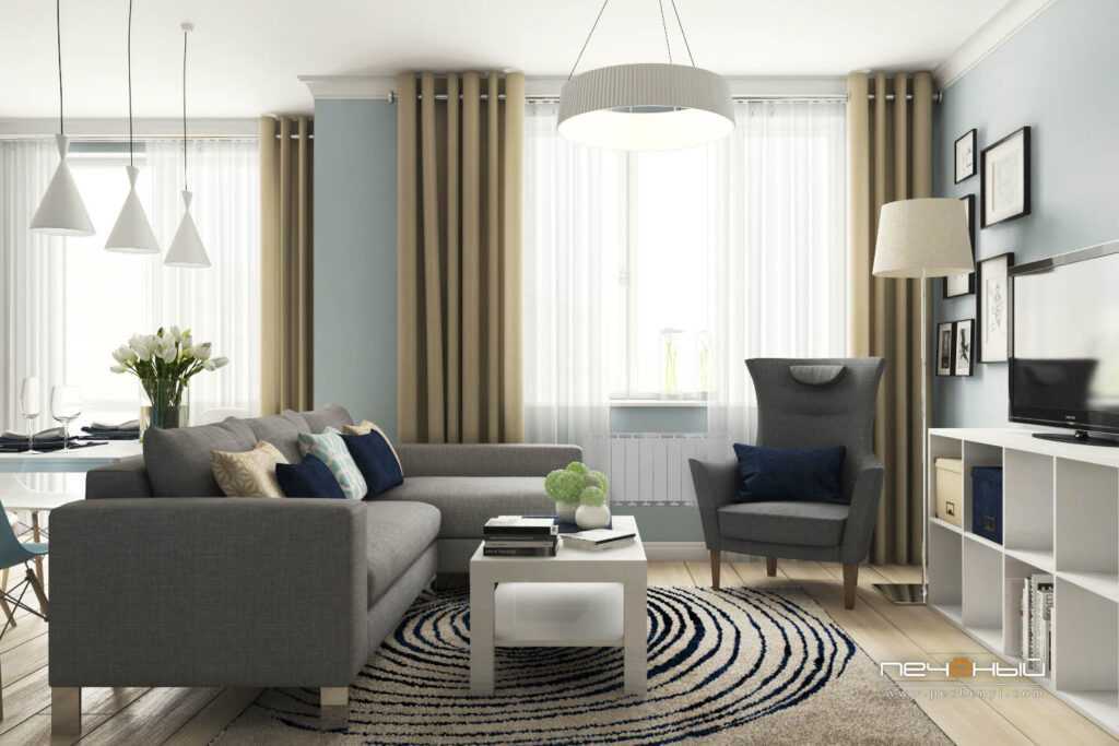 Вместительная комната (17,9 м²) позволила создать просторную гостиную и детскую. Последняя зонирована гипсокартоновой перегородкой, возведенной не до потолка. Так не создаётся ощущения давления стен. Диван поставлен вплотную к стене, напротив — телевизор. Удачное сочетание синего, бежевого и белого цвета визуально расширяет пространство.