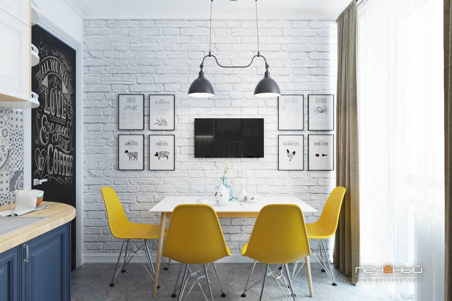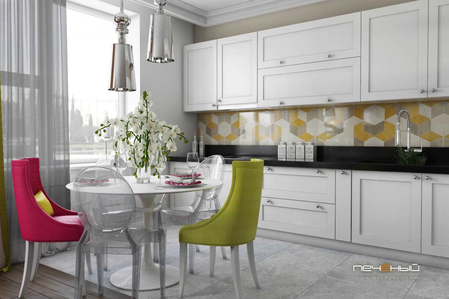 А на этой классной кухне уже сами стулья становятся цветовым акцентом. О, чуть не забыл про чайник – он ведь тоже солнечно-желтого цвета.