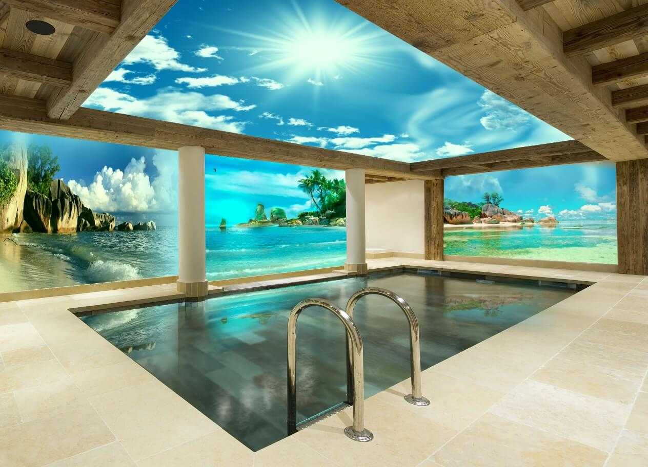 Стеклянный бассейн может быть полностью сделан из стекла, или иметь стеклянное дно либо стенки. Если вы решили сделать стеклянным только дно, это придаст бассейну эффект бездонности и объемности. Бассейн с прозрачной стеной будет выглядеть как логическое уникальное продолжение вашего места отдыха, когда почва внезапно заканчивается и появляется как бы самостоятельно оформленный прозрачный большой сосуд с водой. Такую технологию используют в фешенебельных отелях, на крышах небоскребов на Западе, когда продолжение крыши – это уже воздушное пространство. Это придает некоторый экстрим и возможность наслаждаться окрестными пейзажами.