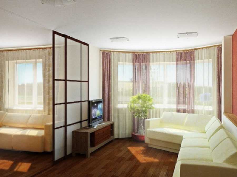 Квартиру зонируют при помощи дивана, стеллажа, барной стойки, ширмы. Реже устанавливают колонны, подиумы с ящиками для хранения вещей, выстраивают арки, полуарки, вешают занавески на потолочном карнизе.