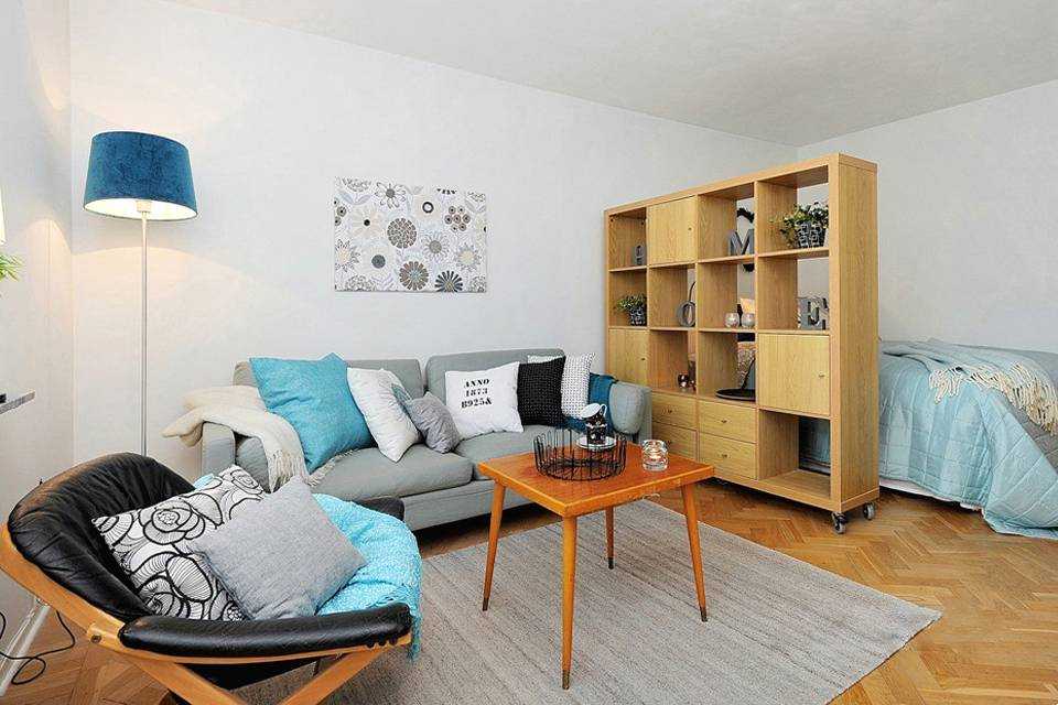 С помощью легкого, сквозного стеллажа с открытыми полками можно оформить очевидное разделение двух комнат. Установив эту мебель у стены или же перпендикулярной к ней, владельцы получат новую площадку для хранения мелочевки и оригинальную межкомнатную перегородку. Чтобы подчеркнуть его «воздушность», расцветку шкафа выбирают из светлых оттенков.