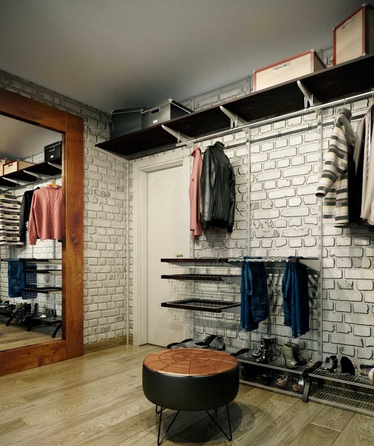 Лофтовый коридор оснащают достаточно крупной грубоватой деревянной мебелью, которая идеально подойдет к кирпичной или бетонной отделке стен. Потолок вовсе можно оставить в первозданном виде. Особенно стиль подчеркнут металлические конструкции, выполняющие роль открытой гардеробной.