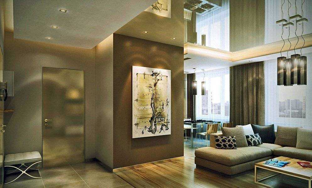 Так как одно помещение, а именно прихожая, не имеет окна, важно правильно подойти к освещению. Гостиная в прихожей без окна за счет правильного зонирования осветительными приборами будет выглядеть уютно и просторно. В гостиной должно быть центральное освещение и несколько дополнительных приборов в виде светильников, бра, потолочных фонариков в прихожей