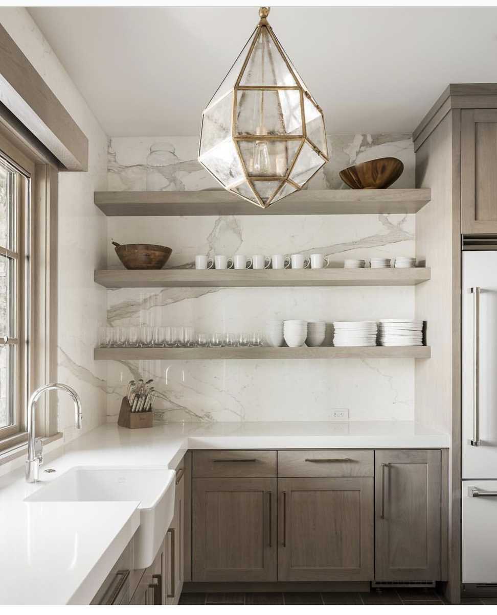 Плавающие угловые полки с широким основанием сегодня находятся на пике популярности. Во-первых, они придают маленькой комнате визуальную воздушность и заставляют ее выглядеть более свежей. Во-вторых, открытые полки позволяют в наилучшем виде представить ваш фарфор и другие декоративные мелочи, делая кухню уютной и приветливой. И наконец, подвешивание плавающих полок занимает сравнительно мало усилий и времени.