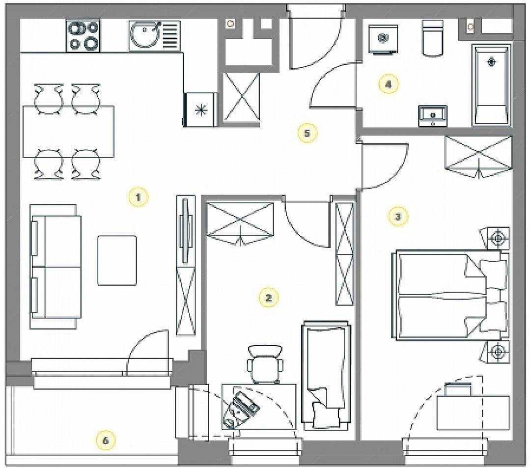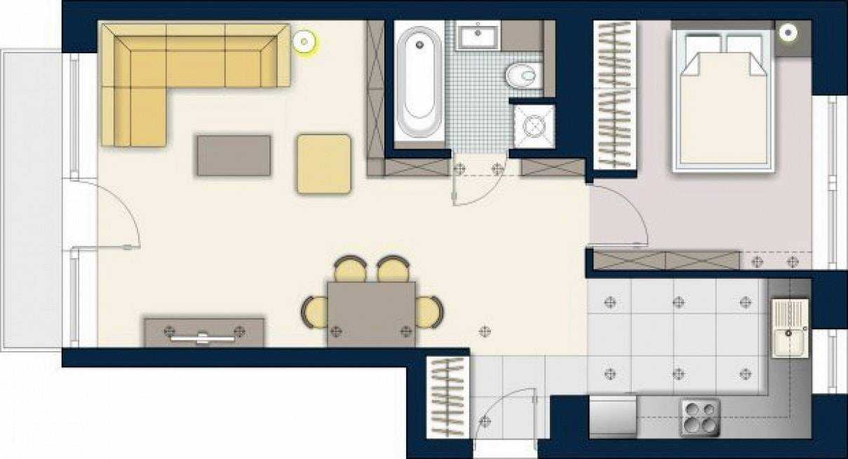 Стандартная планировка двухкомнатной квартиры современного типа выглядит так, как показано на фотографии выше. Здесь есть кухня, гостиная и отдельная спальня с гардеробом…