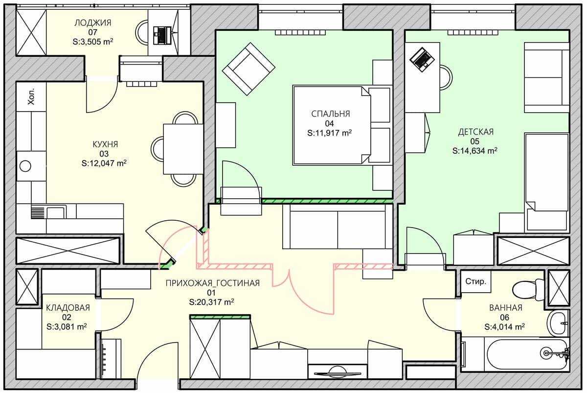 Перепланировка двухкомнатной квартиры 56 квадратных метров