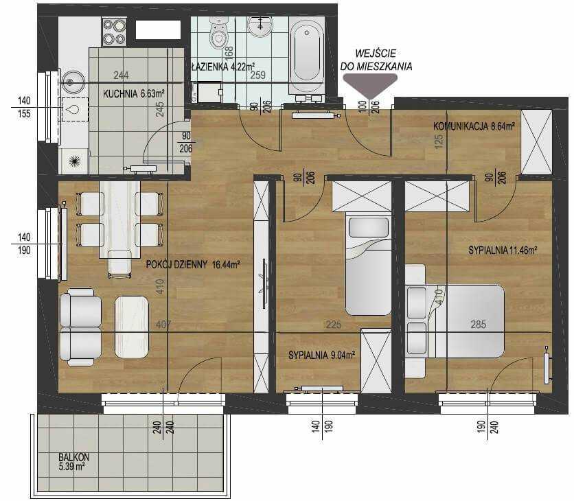 Ещё один вариант с переносом кухни в гостиную, рассчитан на большую семью. Здесь может достаточно комфортно разместиться от 4 до 6 человек. В гостиной на раскладном диване – спальное место для родителей, в одной детской на месте кухни и во второй отдельной спальне с балконом стоит по двухъярусной кровати. Таким образом, здесь всего три комнаты, в которых можно спать. Это будет удобно для семьи с 2-4 детьми или семьи с 1-2 детьми и ещё одним старшим родственником.