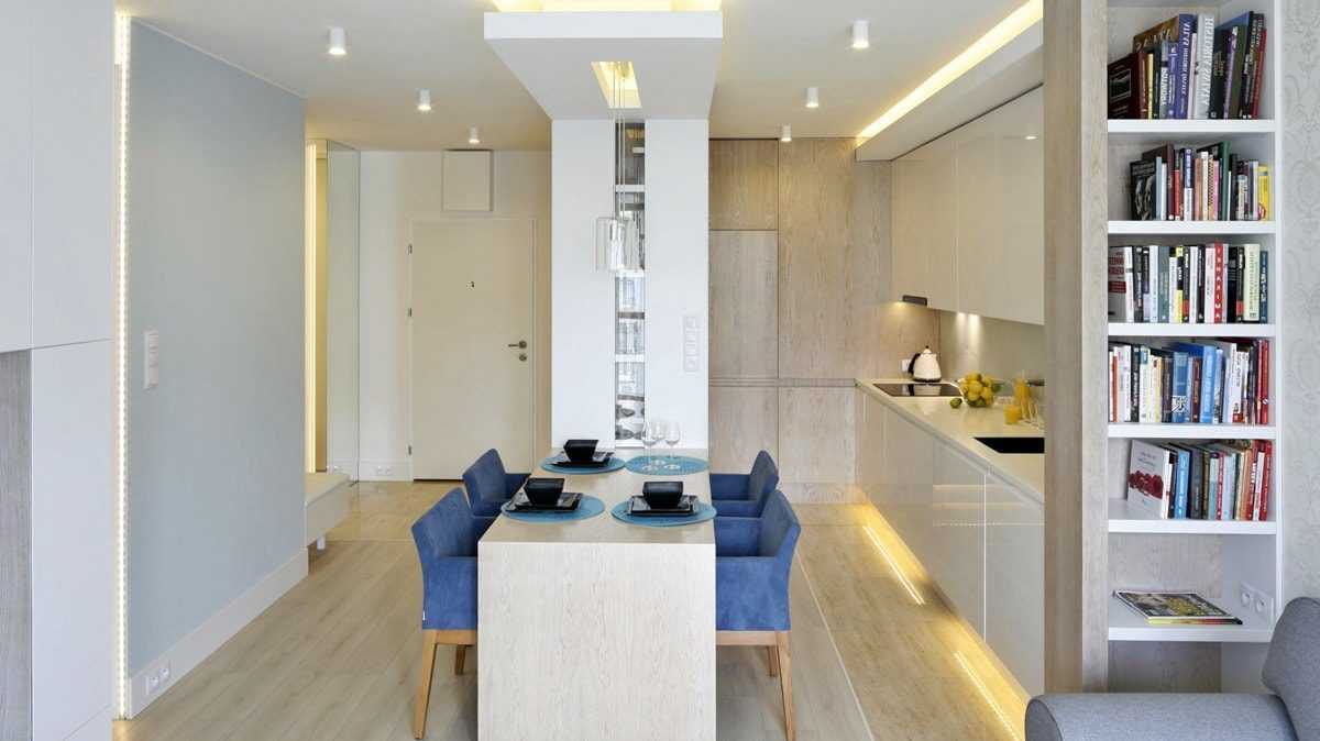 Такую жилую площадь можно оформить полностью интегрированными приборами и техникой, разместить их в нише или замаскировать под общую отделку.