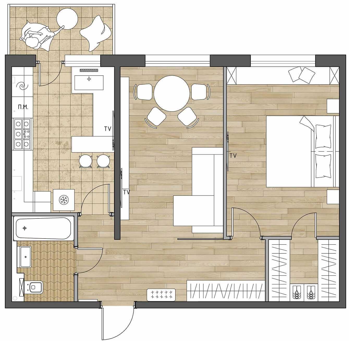 Перепланировка двухкомнатной квартиры в 48 квадратных метров