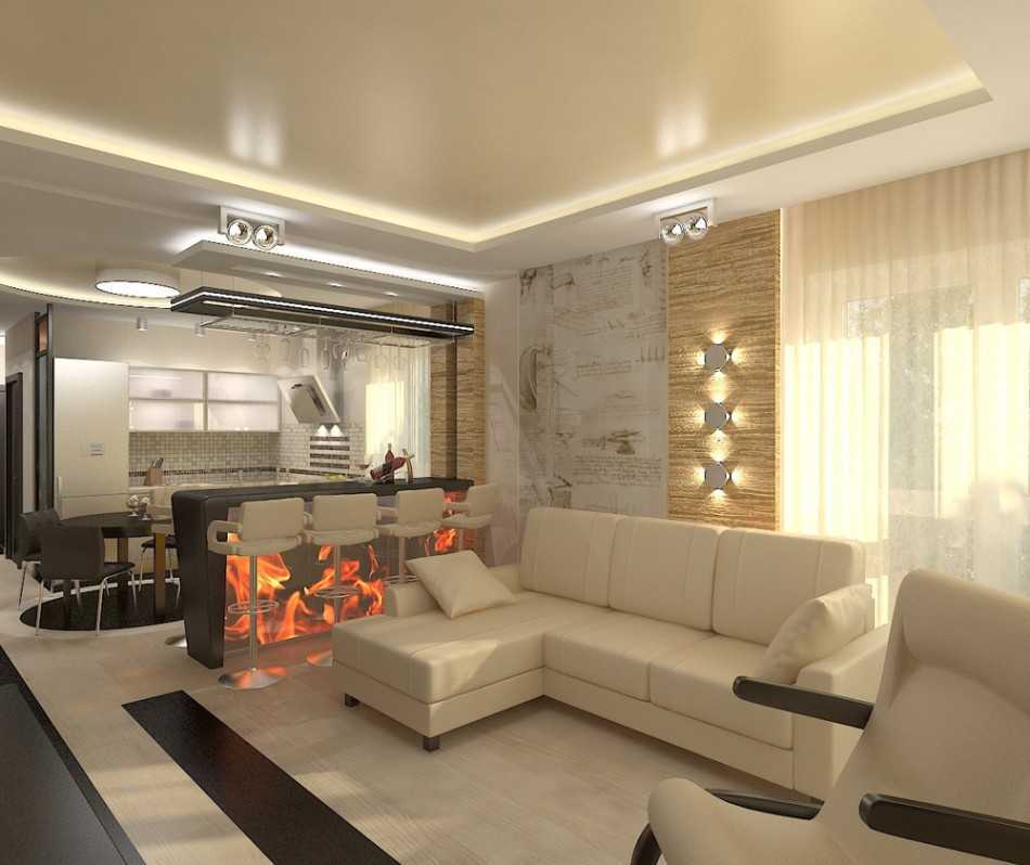 Для дизайна подобной квартиры 100 кв., в основном применяют многоуровневый тип освещения, включающий в себя главную люстру с торшерами, настольными лампами и точечными светильниками.