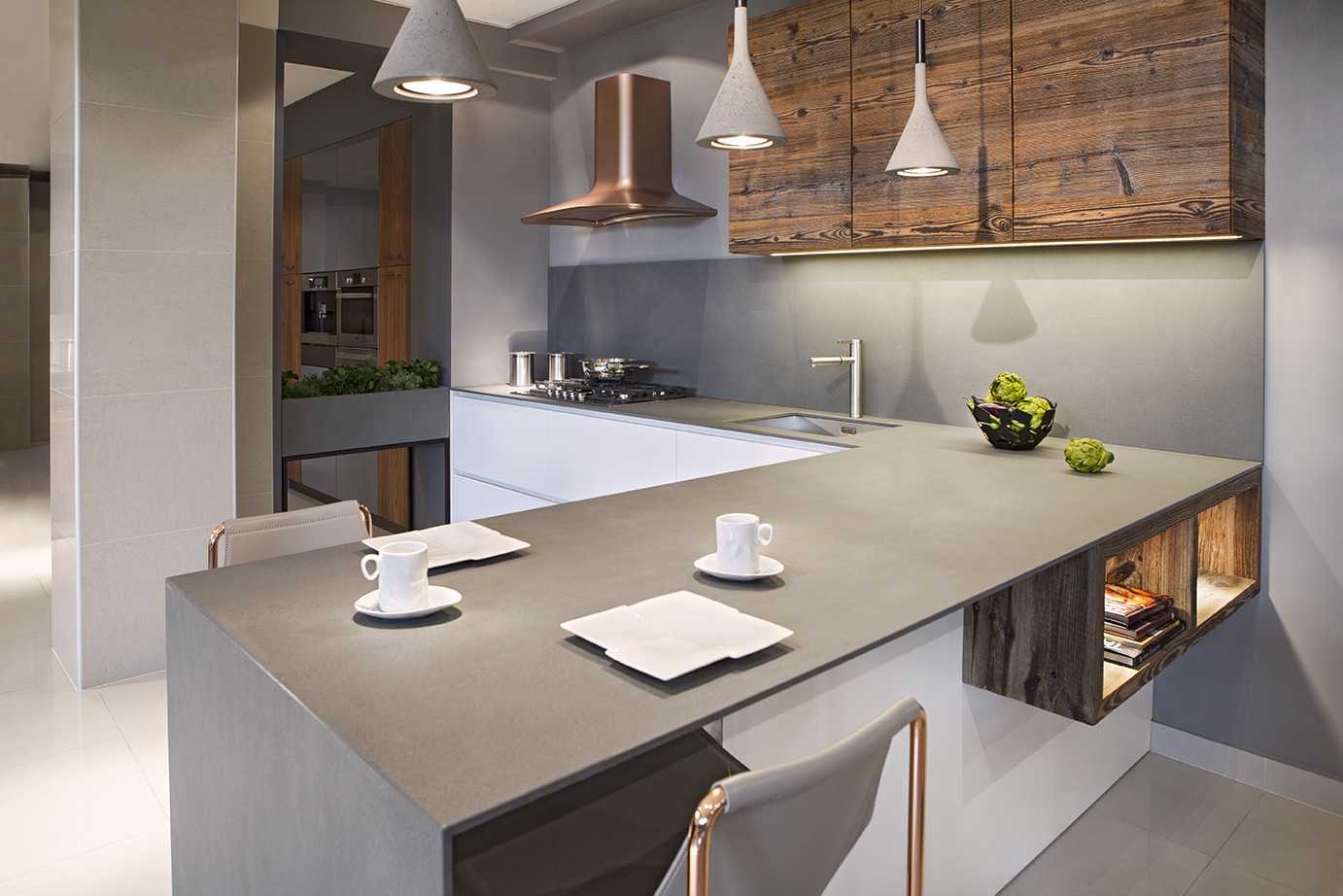 Очень интересно смотрится столешница для кухни из керамогранитного материала. Рабочие столы из крепкого раствора не скалываются, не царапаются и не трескаются. Удается даже избежать вмятин. Также столешница из керамогранитного состава не впитает загрязнения от ярких продуктов и жидкостей, а также жиры. Если установить горячую или ледяную посуду, покрытие не повредится.