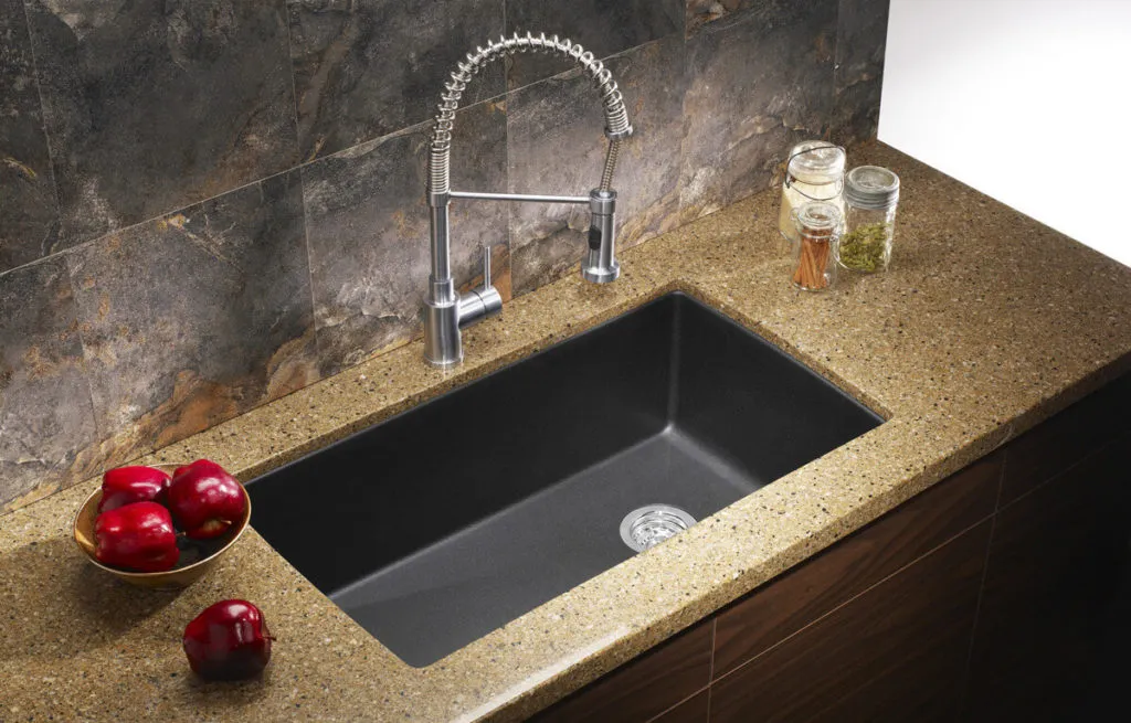 Не редко устанавливается раковина керамогранита. Его свойства позволяют долго сохранять мойке первоначальный вид. Подбирается мойка в разные стили из-за разнообразия размеров, цветов и форм. Цвет подбирается в зависимости от стиля интерьера и обстановки комнаты. У модели может быть форма круга, овала, квадрата, прямоугольника, одна или две чашки, крыло, врезная или накладная чаша.