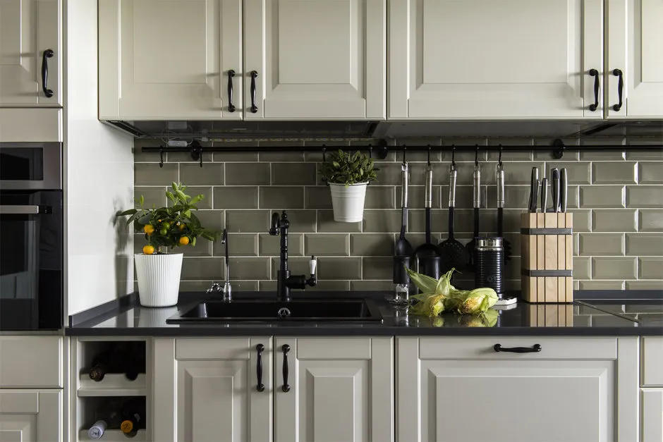 Особенно актуальны крупноформатные плиты керамогранита с имитацией натурального камня, дерева либо металла. Природные материалы лежат в основе тренда на экологичность, поэтому фартук под мрамор или под дуб будет как нельзя кстати.