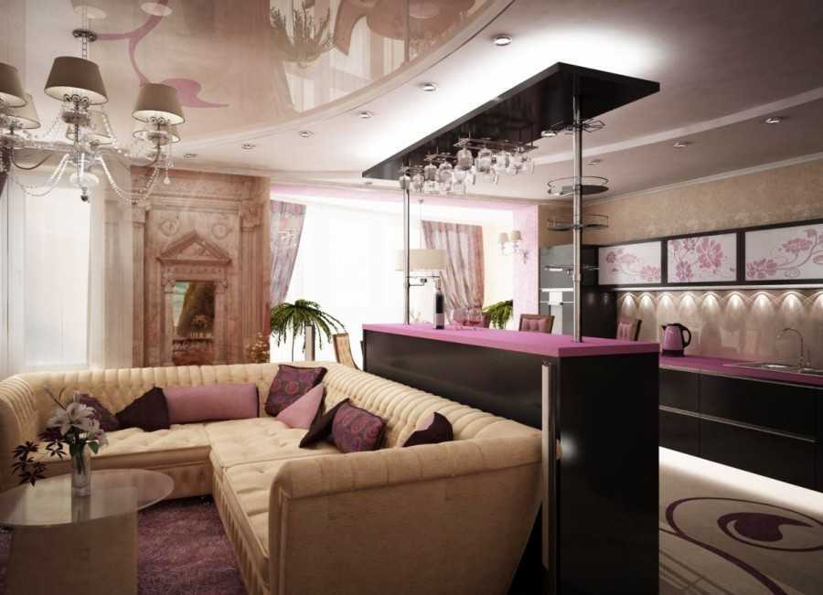 Если коммуникации запланированы в глубине комнаты, то зону кухни отделяют высокой барной стойкой либо красивыми шкафами-витринами.