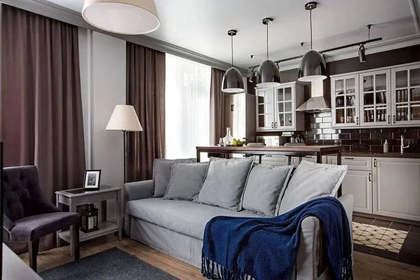 Другой вариант – выбрать 2-3 основных цвета и повторить их по всему пространству гостиной-кухни или квартиры-студии. Такие решения будут сглаживать резкий переход между зонами в пространстве.