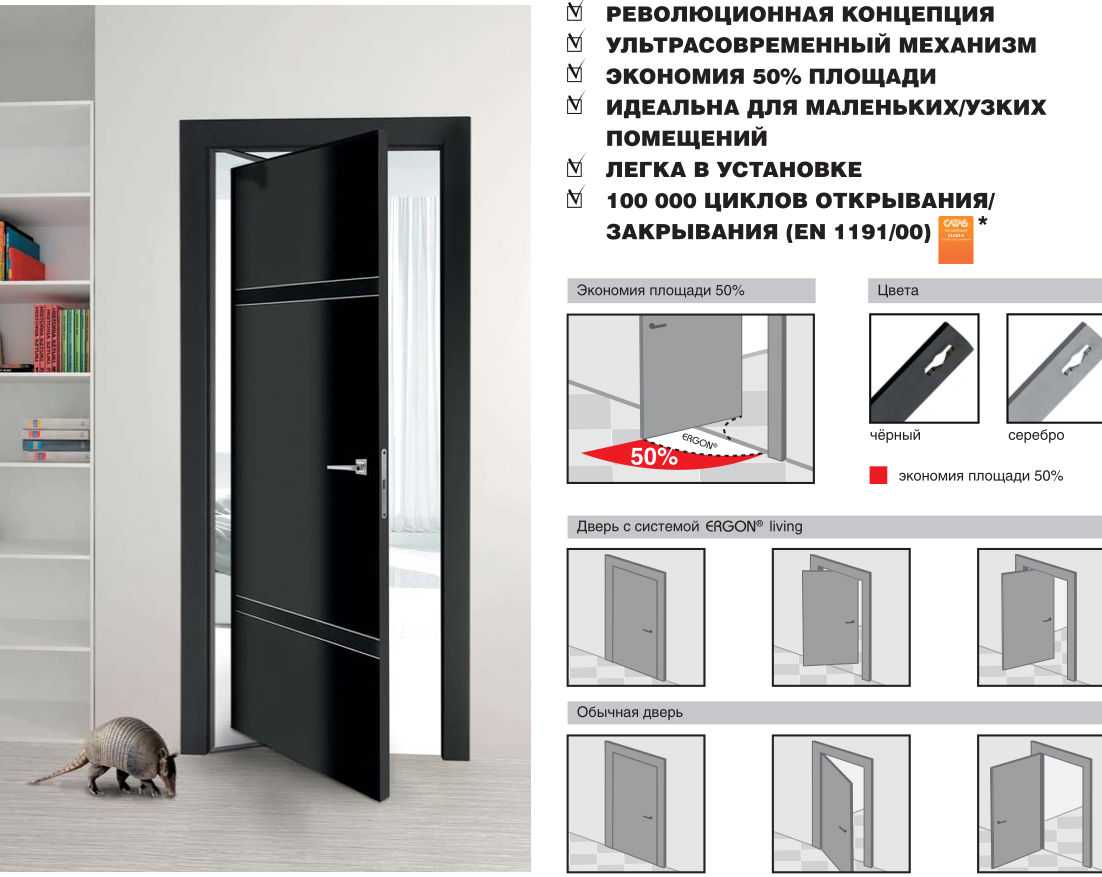 - Возможность устройства в узких проходах и коридорах, где распашная конструкция не сможет нормально открываться.