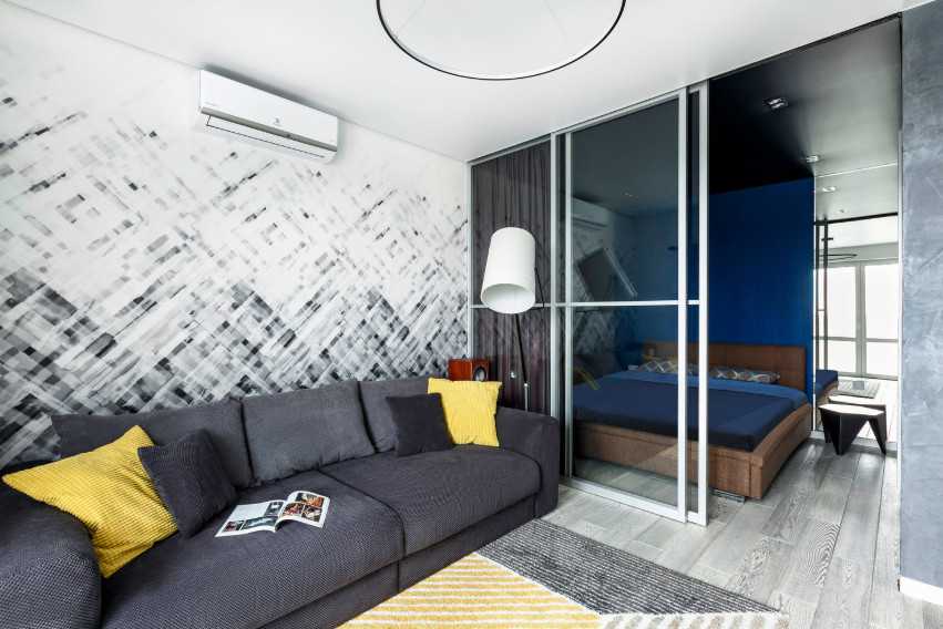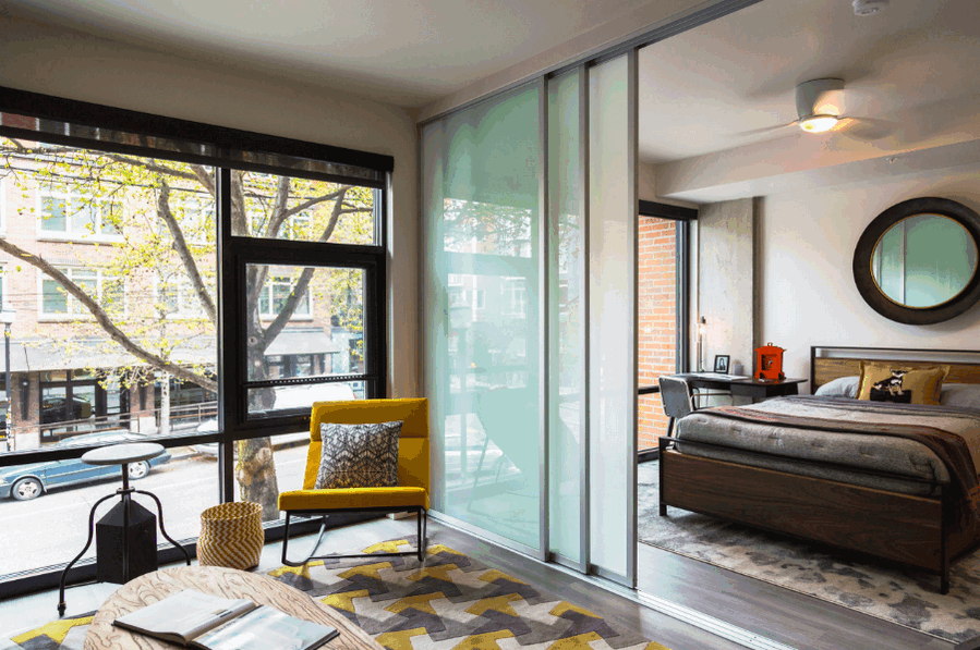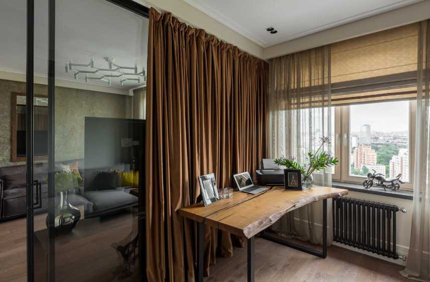 Раздвижную дверь можно увидеть в квартирах-студиях. Она позволяет оградить некоторое пространство для работы или сна от чужих глаз. Также это хорошее решение для помещений, где одновременно проживают члены семьи разного возраста.