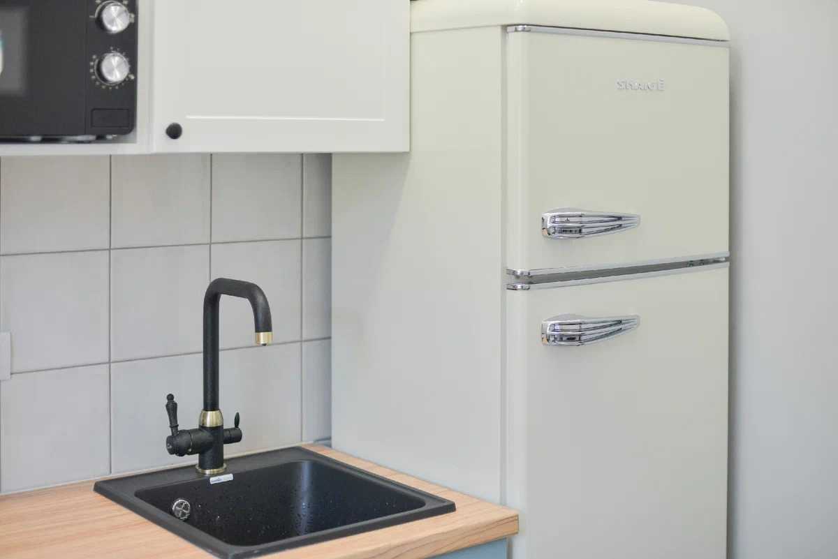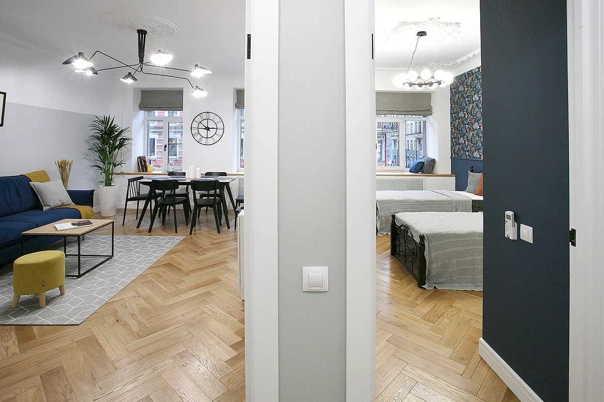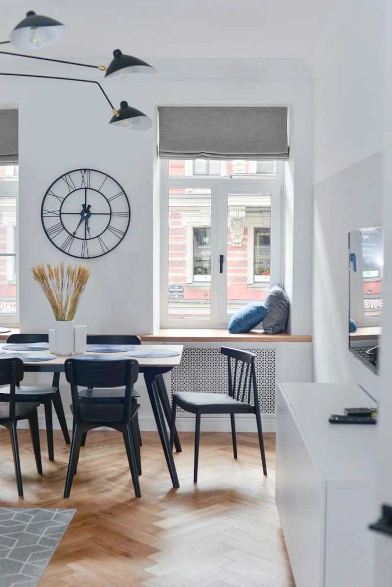 Изначально заказчик планировал оформить нейтральный интерьер в спокойных серых тонах, чтобы он понравился большинству гостей. Но в процессе создания проекта мы решили добавить немного цвета и уйти в ретростилистику. Все-таки старый дом в историческом центре Санкт-Петербурга требует особого отношения.