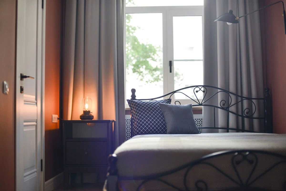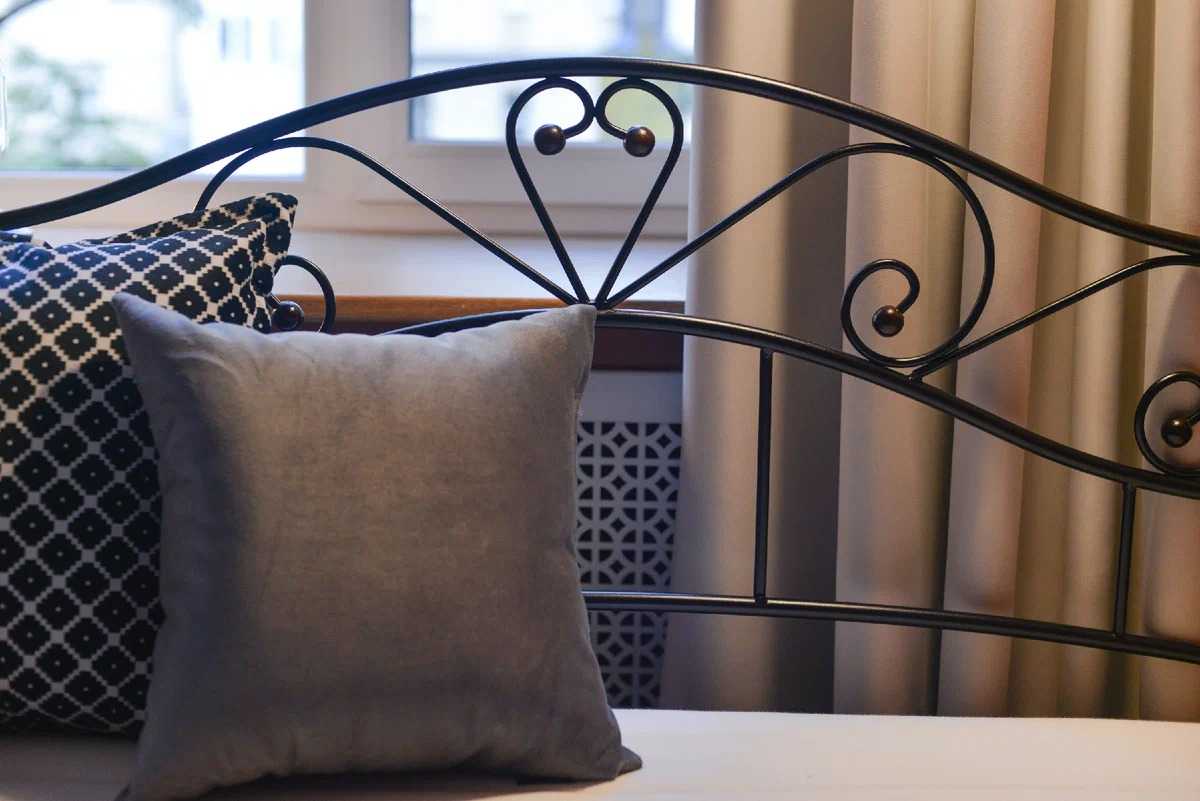 Я долго искала кровати с металлическим узорчатым изголовьем. Подходящие нашлись только у фабрики Орматек. Одна кровать в маленькой спальне расположена напротив окна. Чтобы не перекрывать доступ дневного света, необходимо было подобрать именно такую модель с легким изголовьем.