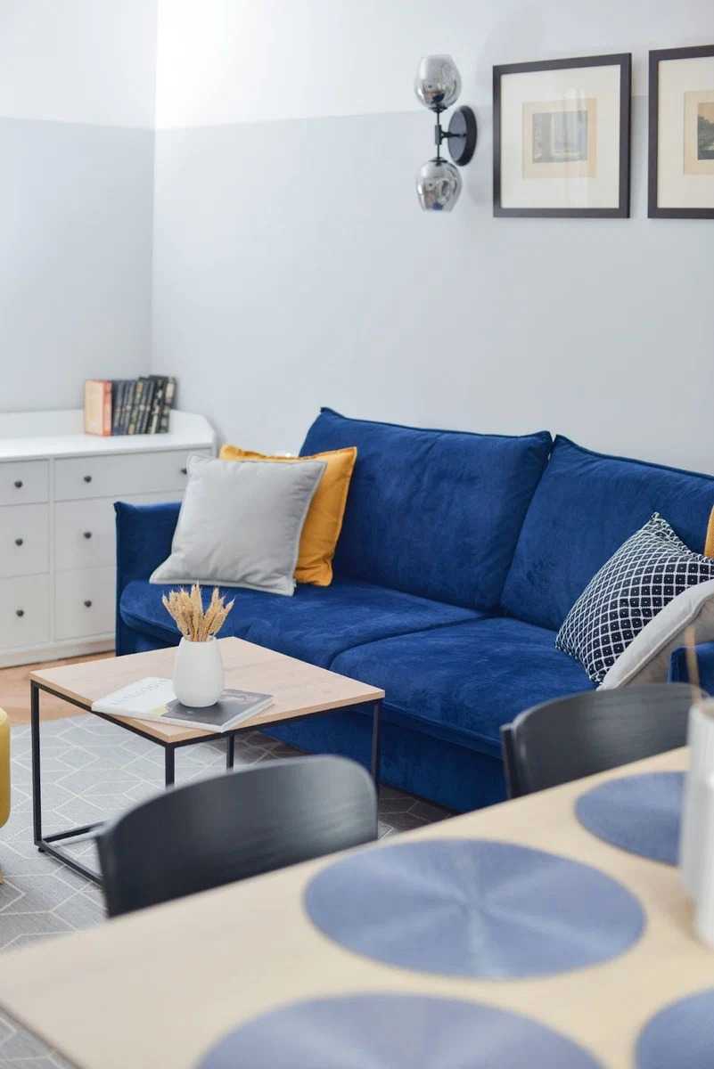 В общую стилистику отлично вписалась мебель от магазина Диван ру. В гостиной установили синий акцентный диван Слипсон, пуф Плиди и кофейный столик Сенги.