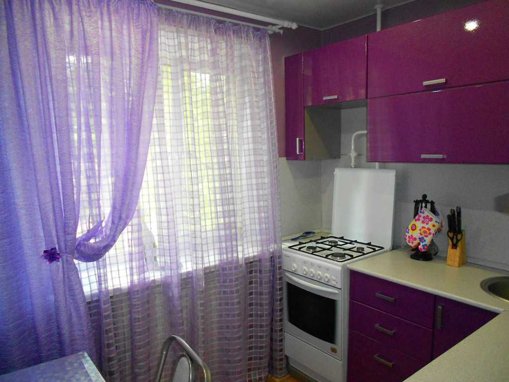 Шторы должны гармонировать с цветами остального интерьера. Для розовой кухни можно выбрать шторы разных оттенков розового или его сочетаний с другими цветами: