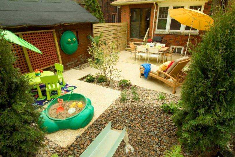 - рядом с зоной отдыха можно обустроить детскую площадку. В игровой зоне для детей будут уместны батуты, песочница и небольшой домик;