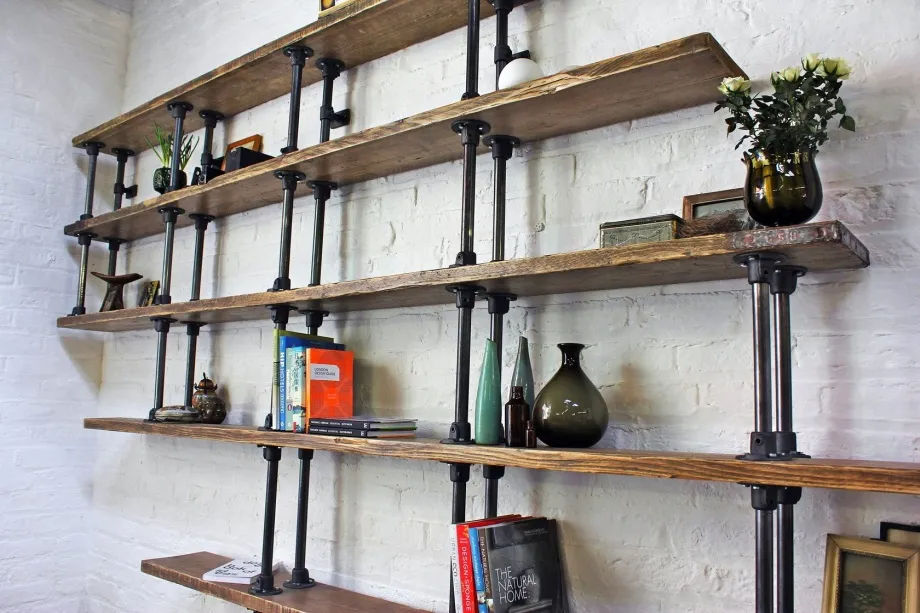 - Держателями полок могут выступать водопроводные трубы, металлические или из пластика. Если правильно подобрать цвет, получится стильная интерьерная деталь, которую оценят поклонники современных стилей (например, лофт).