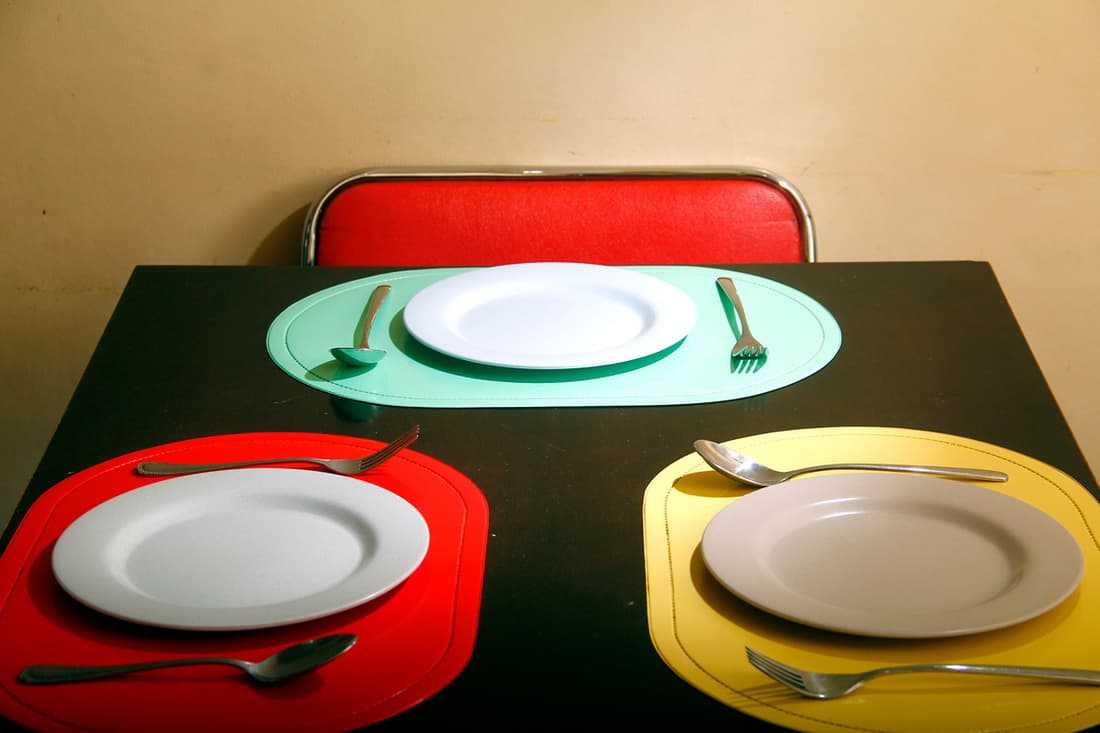 These place settings feature the three primary colors, forming the perfect color wheel.