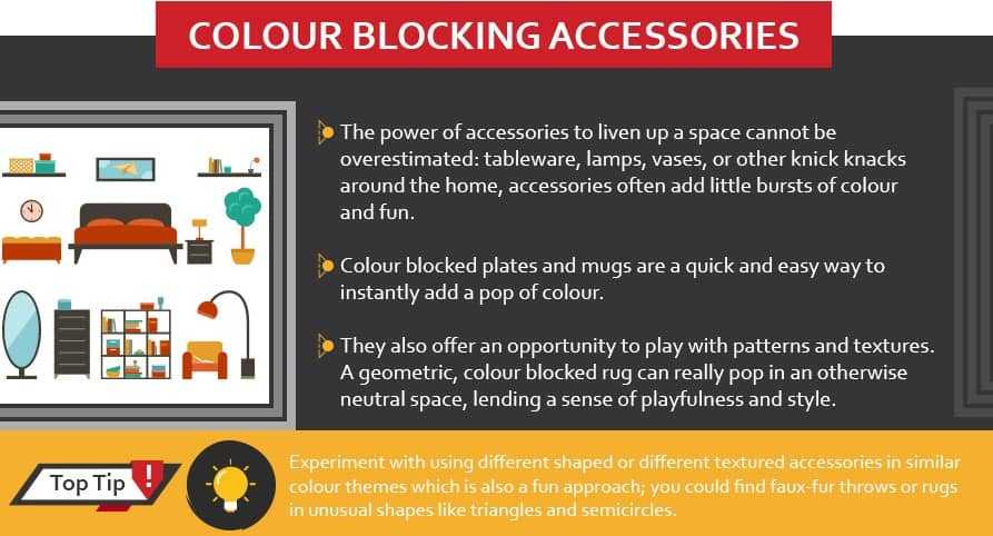 Color blocking doesn’t have to stop at the walls and ceiling. Consider color blocking various accessories in the room for added intrigue.