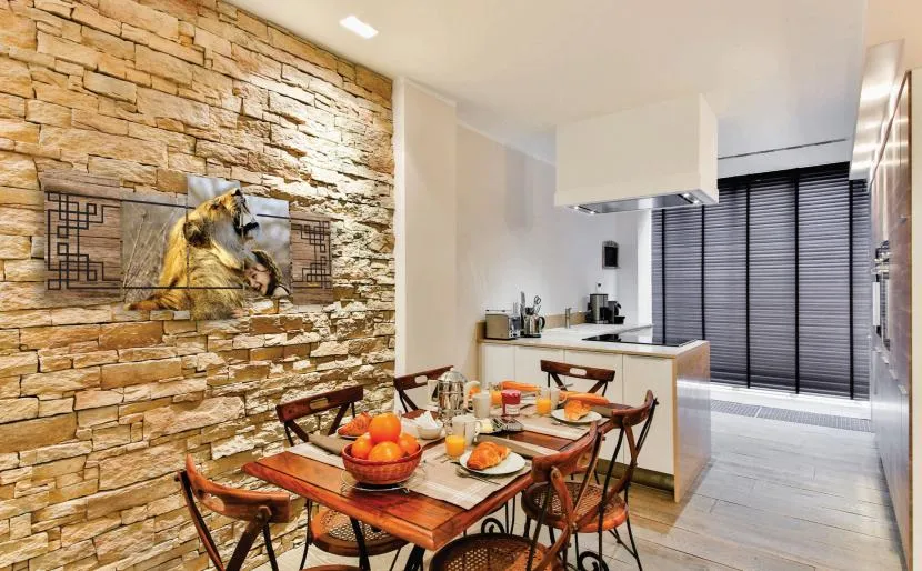 Чаще всего интерьер кухни декорируется с использованием искусственной облицовки. Это бюджетное решение. Не стоит забывать и о том, что материалы натурального происхождения обычно выглядят массивно в таких помещениях.