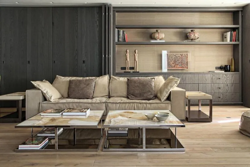 - модульная мебель, например, журнальный столик превращается в обеденный, из шкафа опускается кровать или откидная столешница, из подиума выезжает ещё одно спальное место;
