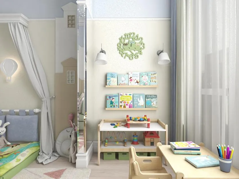 Детская комната. Светлые и пастельные расцветки действуют успокаивающе на нервную систему ребёнка или подростка, разнообразные системы хранения помогают справиться с беспорядком. В отличие от остальных комнат, в детской допускается несколько акцентов: яркое кресло-мешок, ковёр, открытый стеллаж с игрушками и книгами, коллекция рисунков или фотографий.