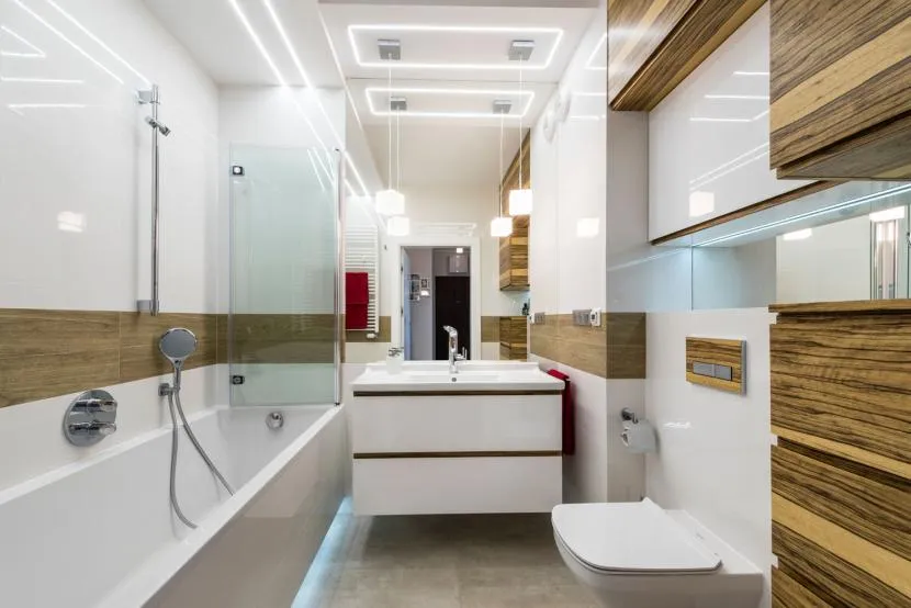 Ванная. Для неё выбирают сантехнику и мебель в минималистичном стиле, используют несколько осветительных приборов. Чтобы усилить впечатление, подбирают соответствующие аксессуары: полки, мыльницы, крючки, дозаторы простой формы, из хромированного металла и матового стекла.