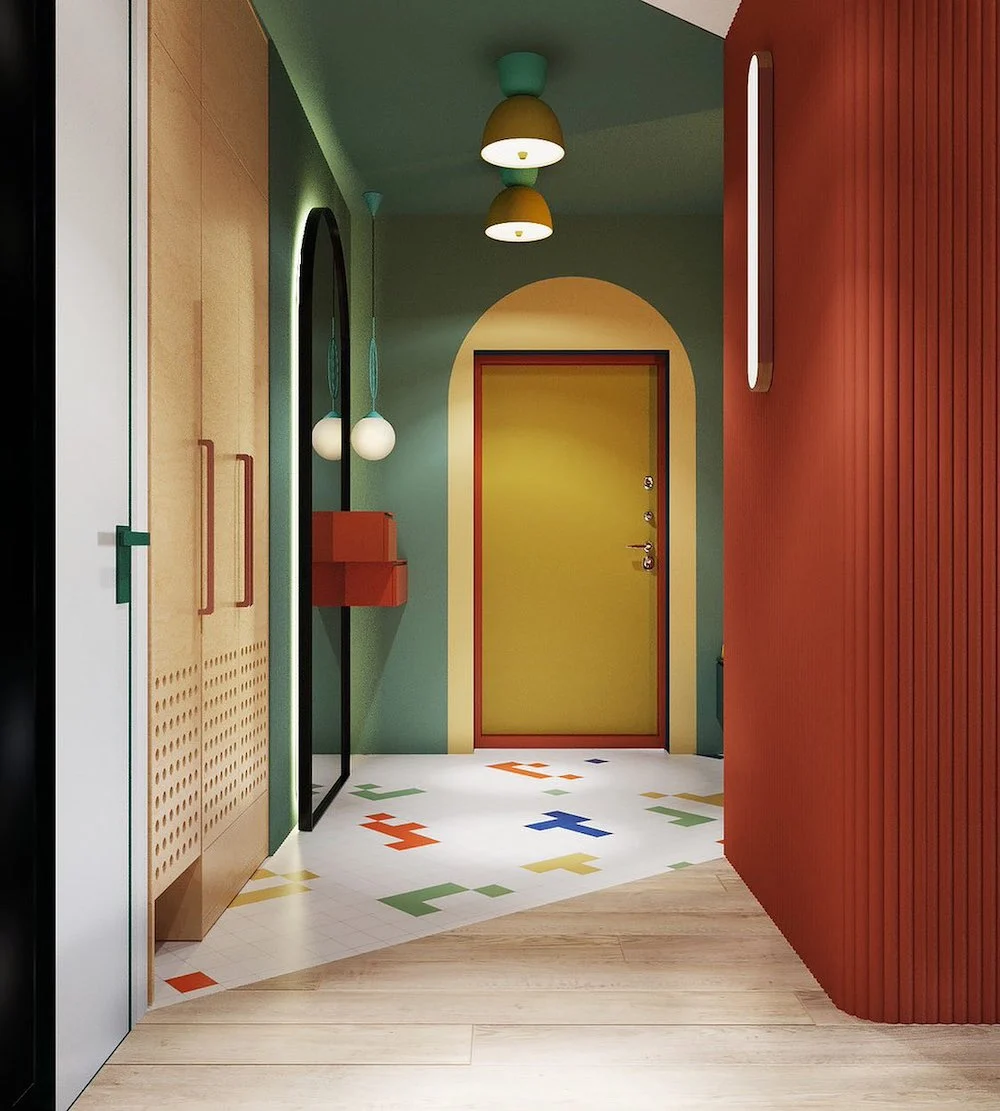 Яркие и контрастные цветовые сочетания создают ощущение энергии и динамики в помещении. Часто используются сочетания ярких цветов, цветные полосы или геометрические узоры на стенах, полу или мебели.