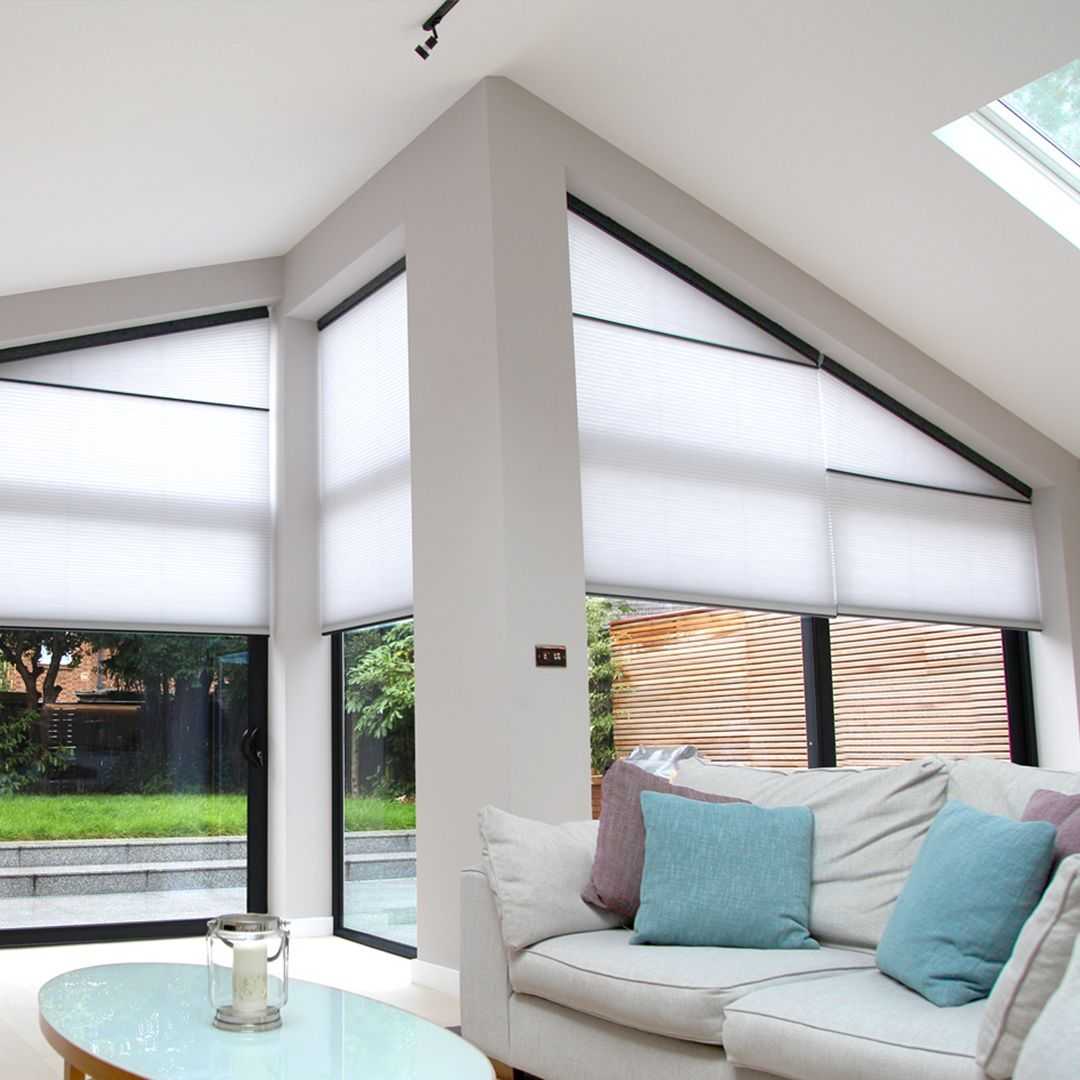 Способствуют созданию идеального геометрического рисунка, поэтому нуждаются в соответствующей поддержке интерьера. Благодаря заглаженным складкам, выполненным из ткани, они внешне напоминают горизонтальные жалюзи. Такие мансардные шторы можно использовать при наклоне мансардных оконных проемов, достигающем 90 градусов. Они могут быть, как одинарными — из сложенной складками ткани, так и двойными – сшитыми в виде сот, что позволяет создавать великолепную шумоизолирующую прослойку.