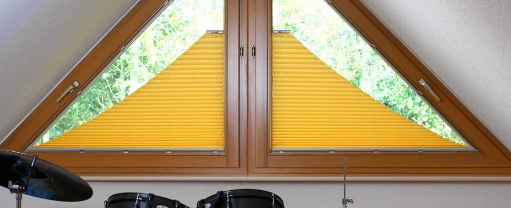 Шторы на треугольные мансардные окна (на фото) можно подобрать разнообразные, особенно интересно удается оформить проем, если окно – равнобедренный треугольник. Варианты:
