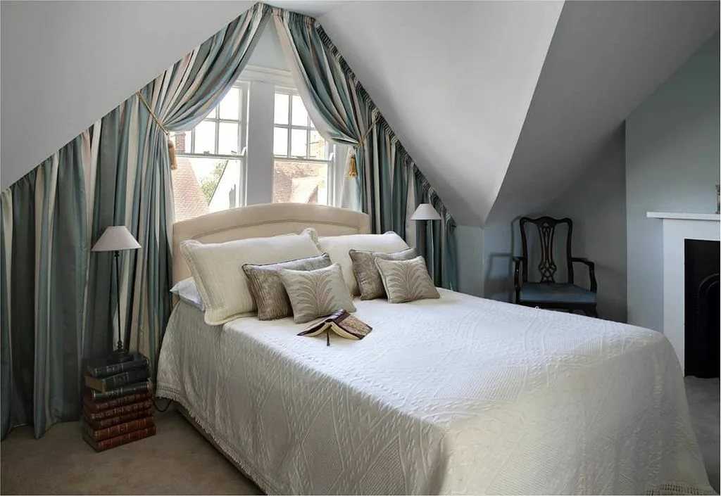 Деревянный интерьер спальни под крышей со скошенным окном и классическими шторами