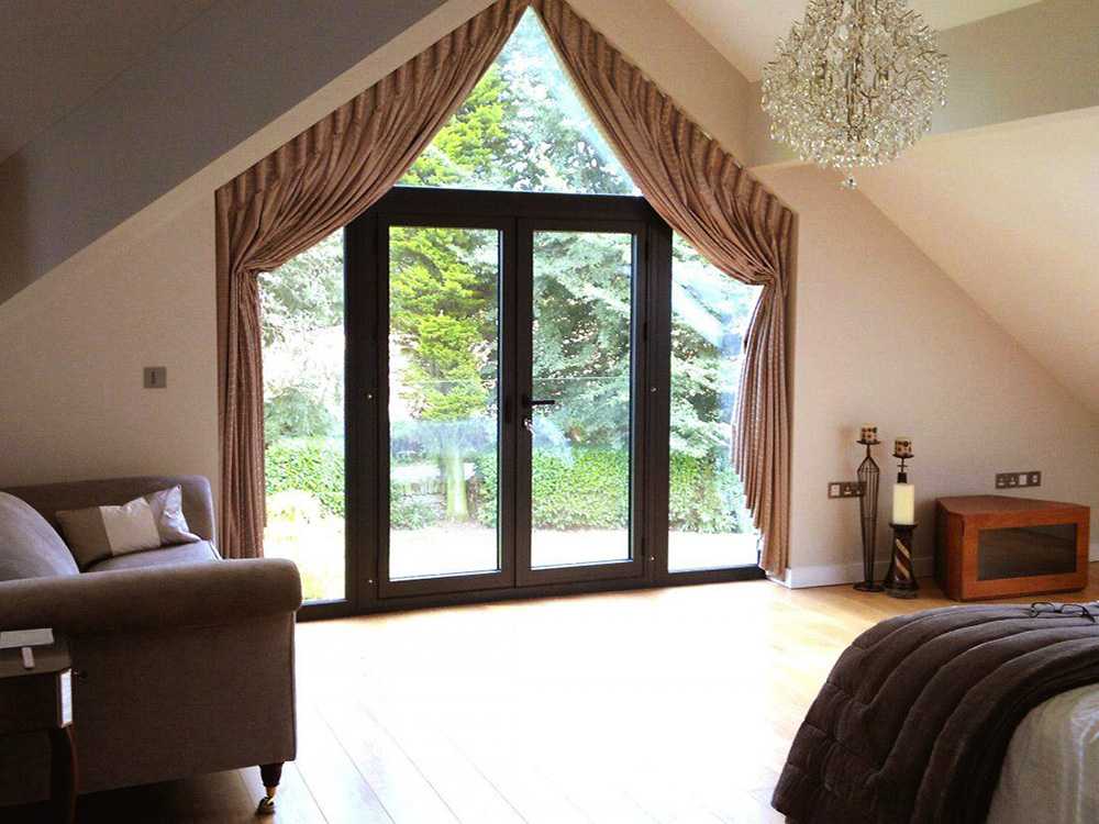 - Треугольные. Крупногабаритные конструкции устанавливаются на фронтоне. При оформлении чаще всего используются фиксированные портьеры, закрепленные на одном или двух наклонных карнизах, размещенных вдоль верхних сторон треугольника. Также можно использовать тюль, гардины с подхватами, установленные на зафиксированных подвесах.