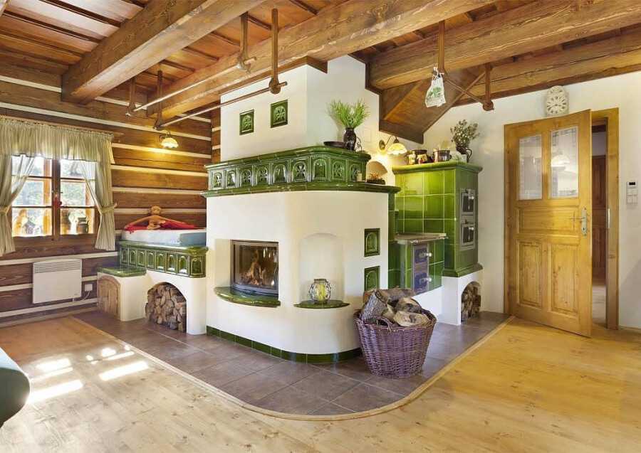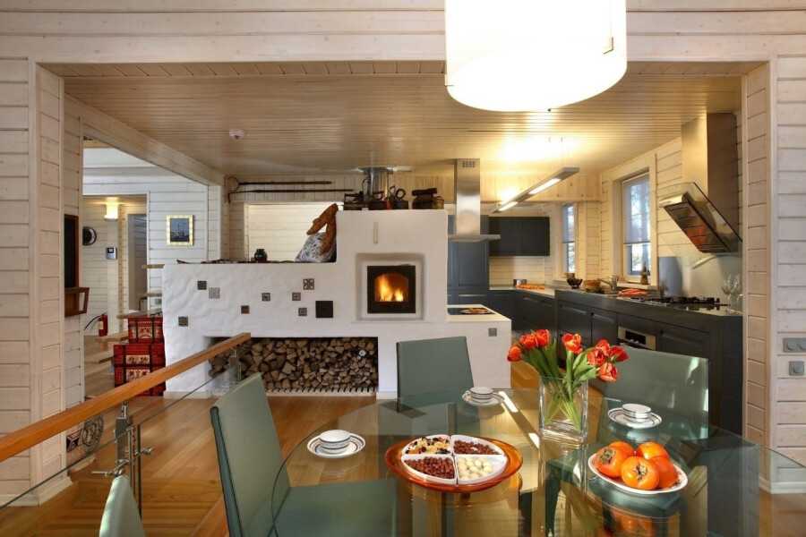 Русская печь занимает много места и требует согласования монтажа, потому в современном интерьере ее заменяет камин