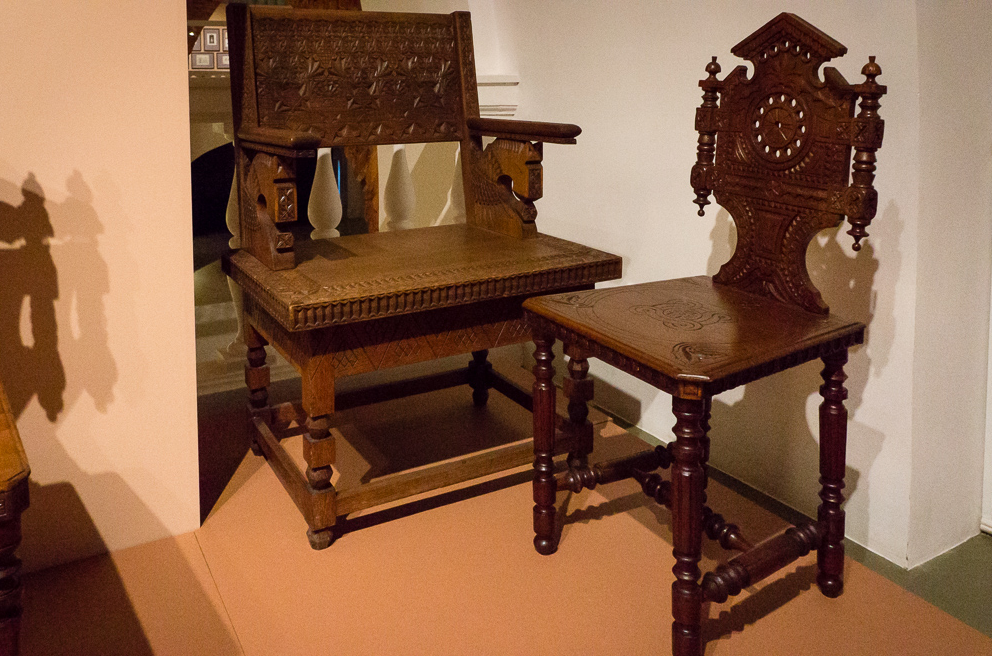 В домах дворян все несколько иначе. Кухню украшает массивный деревянный буфет с выдвижными ящиками, фацетными стеклами и фигурной резьбой. В гостиной — изящные угловые шкафы со скульптурами и яркими вазами, стулья на изогнутых ножках, секретеры.