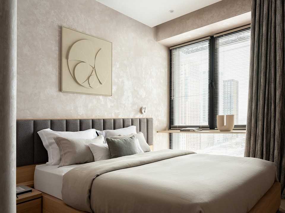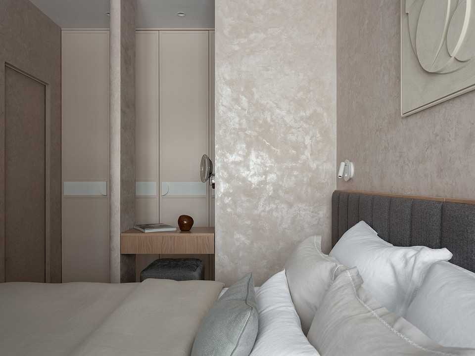 За счет отделки интерьер получился мягким, уютным, обволакивающим. Там, где это было возможно, дизайнер отказалась от острых углов. Например, построенная колонна в спальне, которая отделяет гардеробную зону от зоны сна — с закругленными краями.