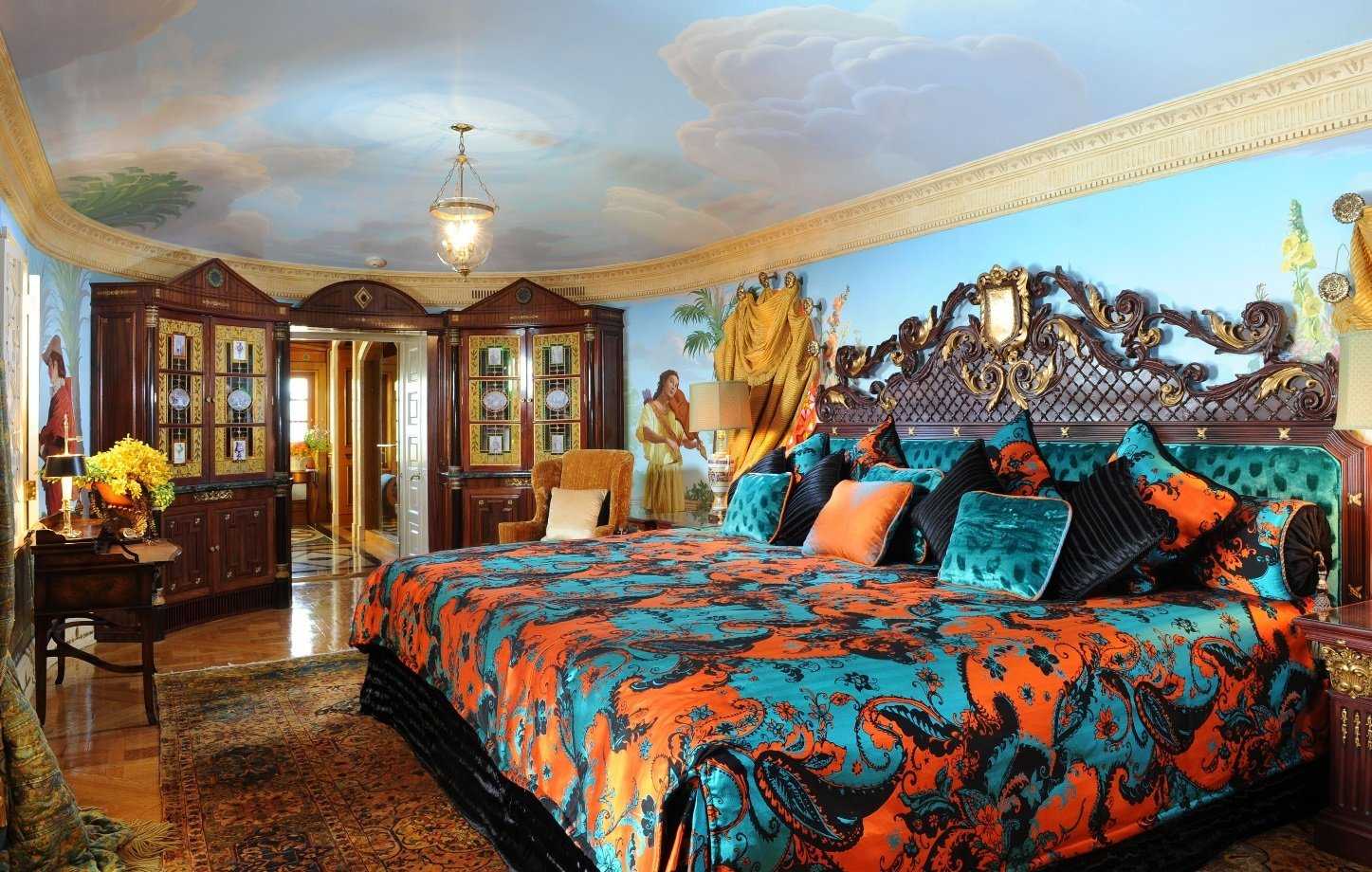 Комнату для отдыха не рекомендуется перенасыщать миксом разных фактур и броских цветов. К глянцевой гладкой отделке стен подходят тяжелые фактурные шторы, покрывала, ковры, выполненные в технике пэчворк. Богатый и утонченный декор разбавляют лаконичными тумбочками. Своеобразный шарм вносят светильники с ажурными плафонами, китайские фонарики, кровать с кованым изголовьем, искусственная шкура. В однокомнатной квартире кровать заменит матрас с разноцветными подушками, который накрывается плюшевым пледом, при необходимости быстро убирается.