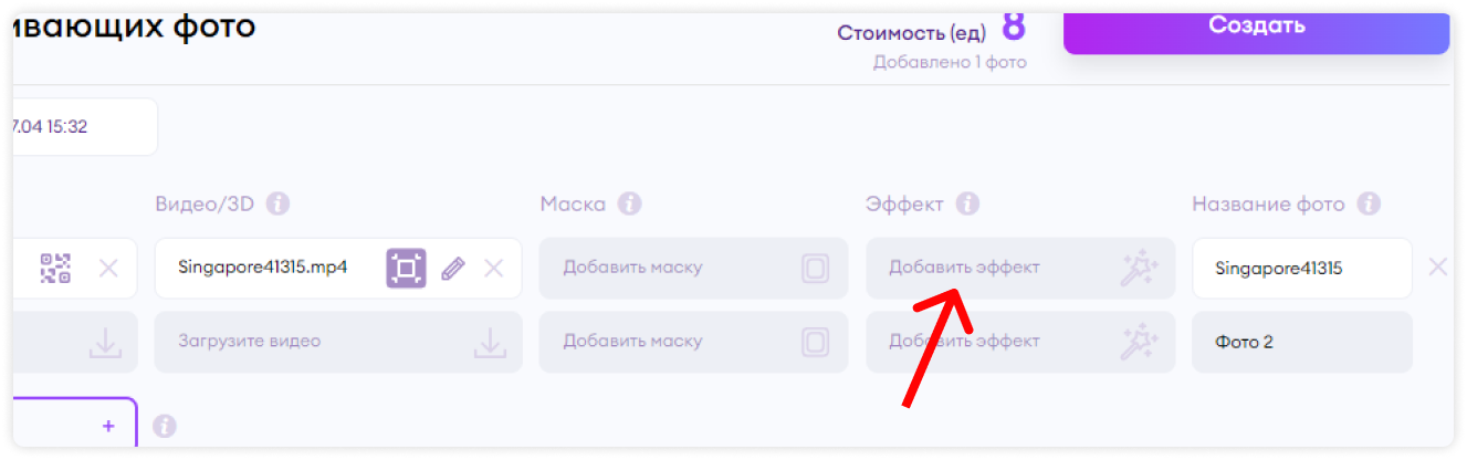 Эффект — это анимированное видео с прозрачностью поверх изображения. Чтобы добавить эффект, нажмите на ячейку Эффект. В открывшемся окне сможете выбрать понравившийся эффект