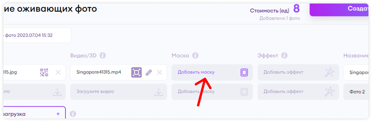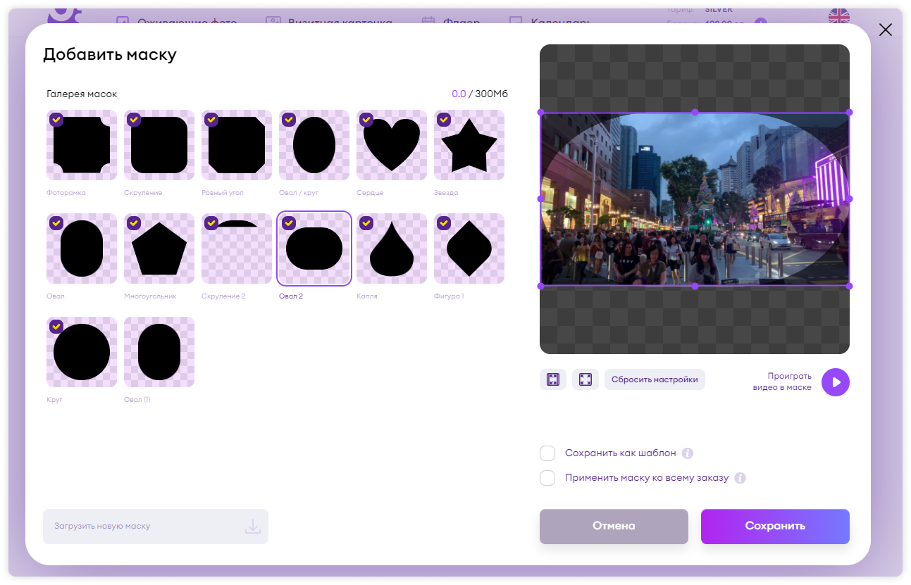 После того, как вы выбрали фото и видео, нажмите на ячейку Маска, откроется окно выбора и загрузки маски: